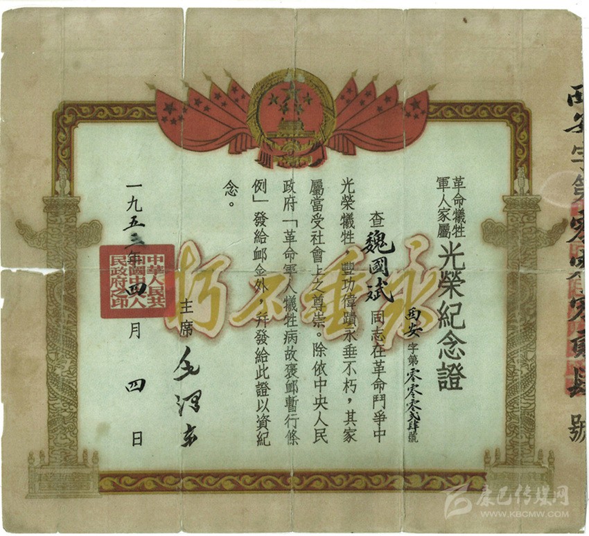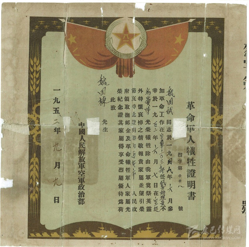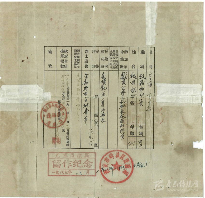 魏國(guó)賓的革命軍人犧牲證明書。