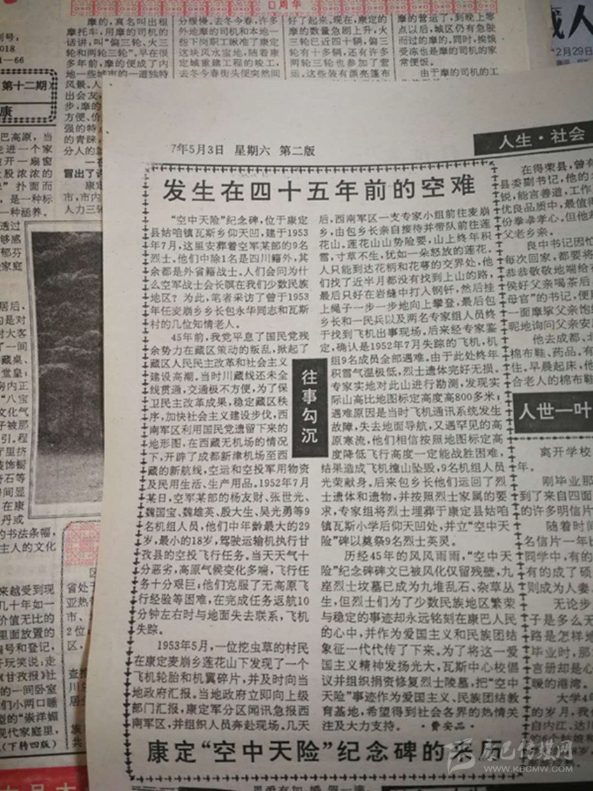 《甘孜日?qǐng)?bào)》1997年5月3日第二版刊登了《發(fā)生在四十五年前的空難——康定“空中天險(xiǎn)”紀(jì)念碑的來(lái)歷》一文,詳細(xì)記錄了1952年空軍某部9名人員駕駛運(yùn)輸機(jī)執(zhí)行空投飛行任務(wù),不幸在康定地區(qū)撞山墜毀,英勇犧牲的故事。這9名烈士后被當(dāng)?shù)厝罕姲苍?,建立“空軍墓”和“空中天險(xiǎn)”紀(jì)念碑。 作為烈士犧牲地的甘孜多年來(lái)一直在尋找這9名烈士家屬,以圖告慰英靈。但由于線索有限,一直未有結(jié)果。