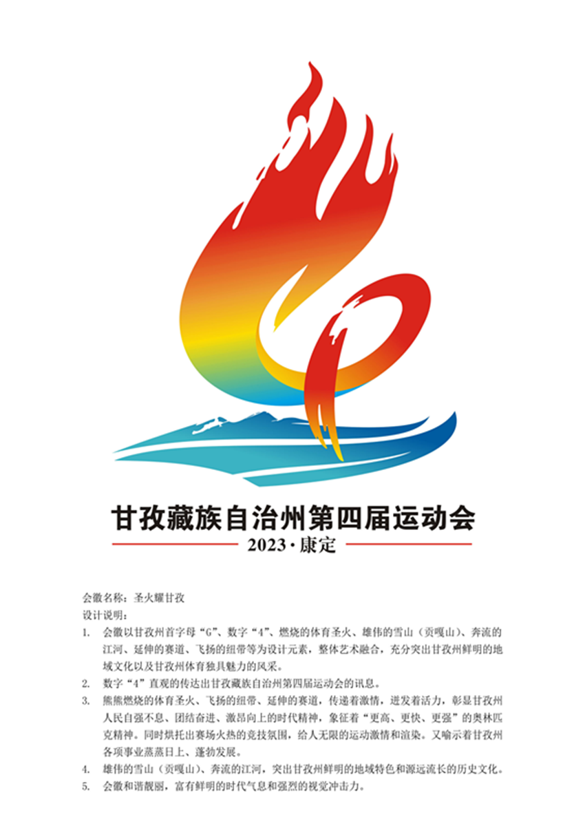 據(jù)王拓進介紹,會徽設計靈感來自網(wǎng)上看到的貢嘎雪山,所以作品以甘孜州首字母“G”、數(shù)字“4”、燃燒的體育圣火、雄偉的雪山(貢嘎山)、奔流的江河、延伸的賽道、飛揚的紐帶等為設計元素。數(shù)字“4”直觀地傳達出甘孜州第四屆運動會的訊息;雄偉的雪山(貢嘎山)、奔流的江河,突出甘孜州鮮明的地域特色和源遠流長的歷史文化;熊熊燃燒的體育圣火、飛揚的紐帶、延伸的賽道,傳遞著激情、迸發(fā)著活力,彰顯甘孜州人民自強不息、團結(jié)奮進、激昂向上的時代精神,象征著“更高、更快、更強”的奧林匹克精神,同時烘托出賽場火熱的競技氛圍,給人無限的運動激情和渲染,又喻示著甘孜州各項事業(yè)蒸蒸日上、蓬勃發(fā)展。
