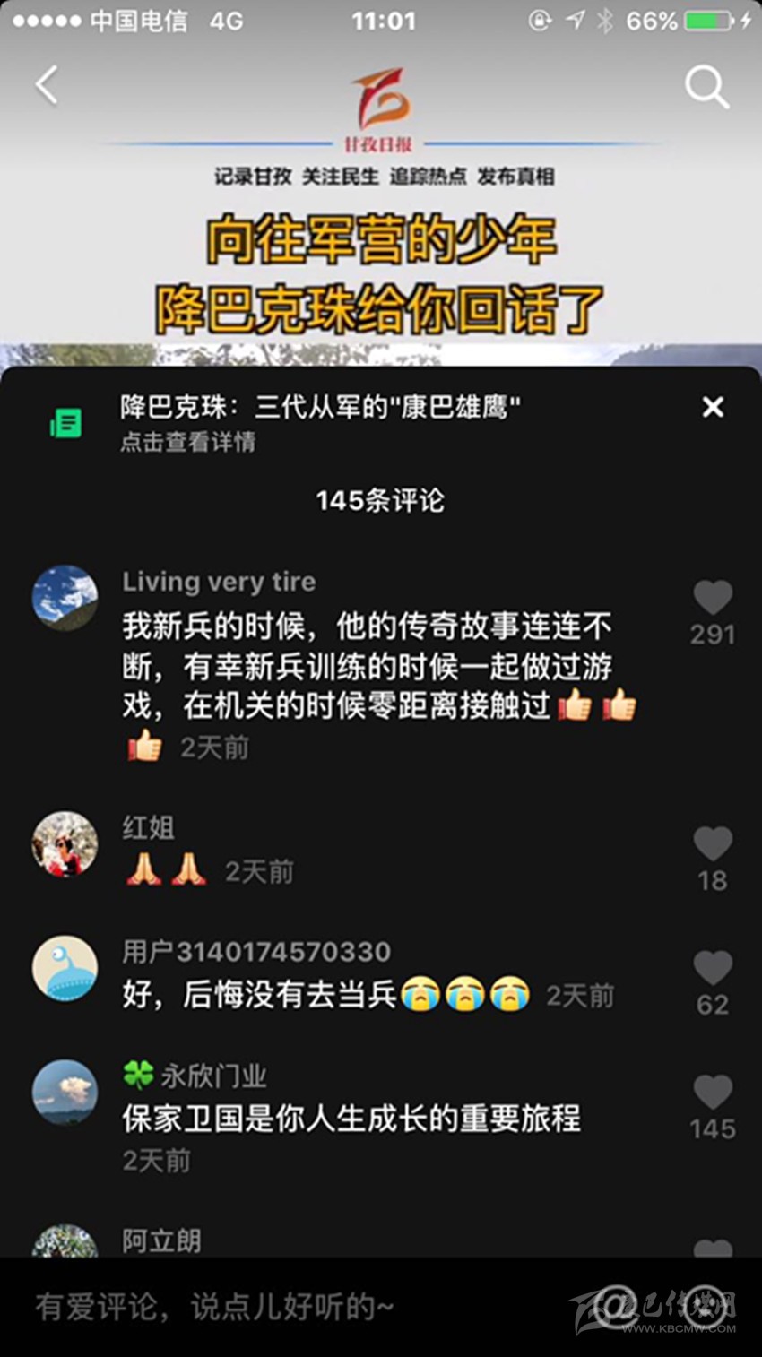 三段視頻,六百多條留言,近兩千萬(wàn)次播放,一個(gè)藏族少年的軍旅夢(mèng)在網(wǎng)絡(luò)上熱烈綻放,而農(nóng)牧區(qū)許多青年的軍旅夢(mèng)也就此被點(diǎn)燃,忠勇大愛(ài)的“血脈”在康巴高原傳承! (本網(wǎng)記者 肖宵 整理)