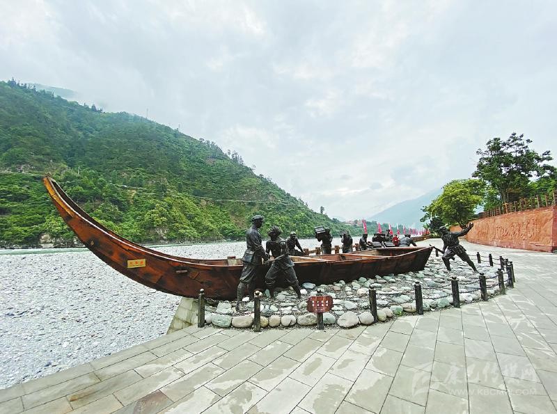 不遠(yuǎn)處的安順場(chǎng)渡口、大渡河邊,矗立著一座“紅軍渡”石碑,上面的三個(gè)鮮紅大字由渡河時(shí)任第一軍團(tuán)第一師一團(tuán)團(tuán)長(zhǎng)楊得志題寫(xiě)。石碑旁陳列著的一艘長(zhǎng)10.5米、寬2.3米、高2.2米的“紅軍船”,正是當(dāng)年紅軍強(qiáng)渡大渡河時(shí)使用的翹首木船復(fù)制品。木船旁,是戰(zhàn)士和當(dāng)?shù)卮兿蚰敬\(yùn)送武器裝備的雕像,斜坡上,勇士隊(duì)伍正奔向渡口。