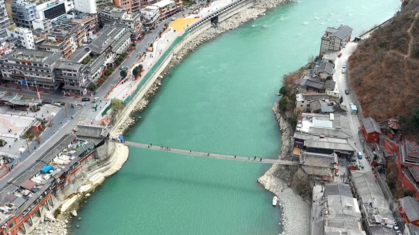 航拍瀘定鐵索橋。