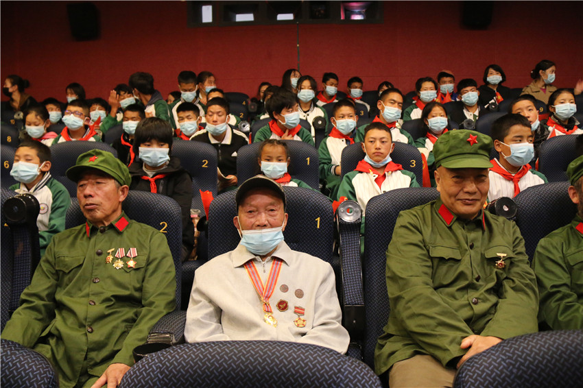 圖為95歲的抗美援朝老兵陳忠(前排中)和退役軍人代表、州特殊教育學校學生一起觀看電影《長津湖》。