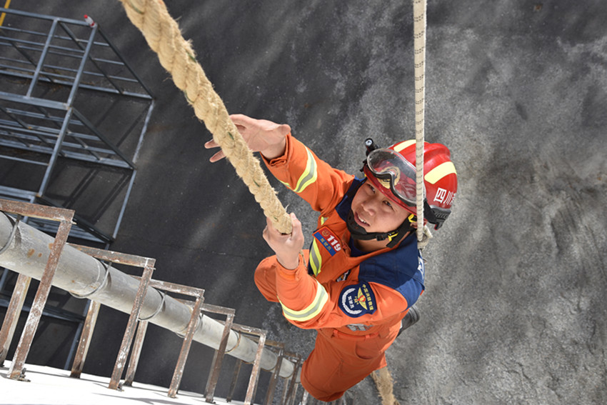 危急時(shí)刻,姜鵬和隊(duì)友迅速開(kāi)展救援行動(dòng)。姜鵬在做好個(gè)人防護(hù)后,立即將救生繩索拴在腰上,從10余米高處一躍而下,利用繩索迅速下降,快速地將被困女子固定住,成功將女子救出。
