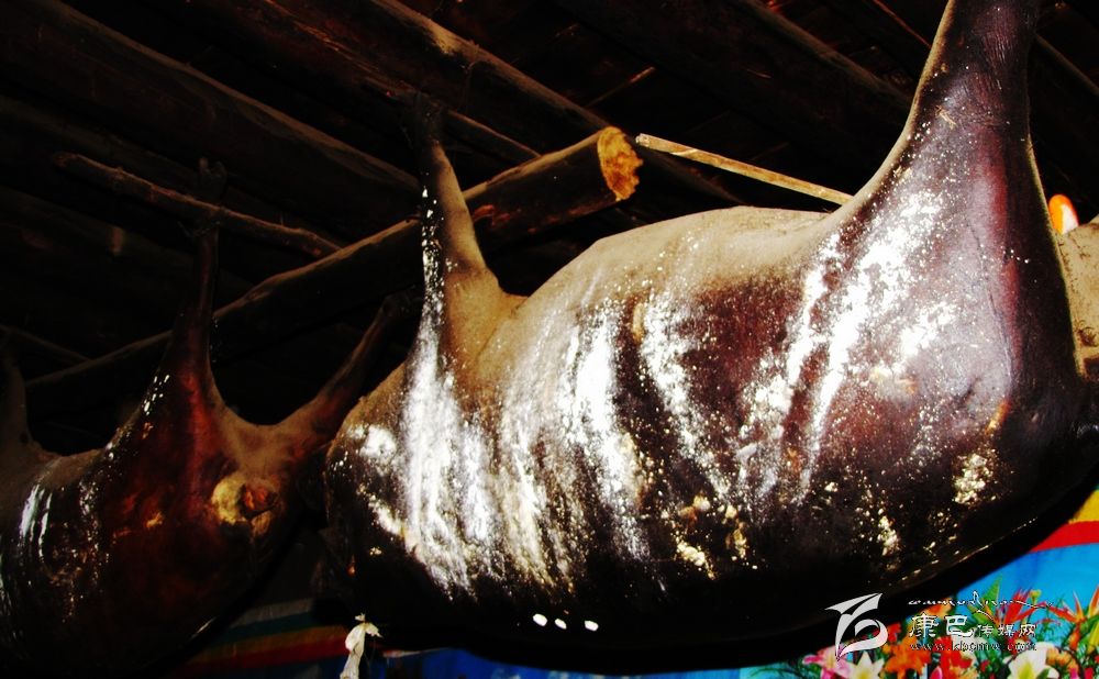 “臭豬肉”的制作過(guò)程和來(lái)歷:豬用玉米和麥子喂肥后,用繩索套豬頸勒死,在其胸開(kāi)一小口將豬心血脈弄斷,使肉中的血全部流回到內(nèi)臟中,再把所有的內(nèi)臟從小口中取出,并填上青稞、麥子等谷物后縫合,再用灶灰和紅土塞住七竅,把氣吹脹,埋在麥糠中10余天吸干水,取出掛在灶上的房梁上自然煙熏數(shù)年即成。其懸掛年限可達(dá)10年以上,最長(zhǎng)的可達(dá)30余年。食用時(shí),隨用隨取,做法也很多,可生吃,可煮食,也可熬湯。扎壩人多愛(ài)生吃,初嘗入口難適,多食后方覺(jué)滿(mǎn)口濃香,回味無(wú)窮。過(guò)去是為防備戰(zhàn)事而儲(chǔ)備食品,后來(lái)就逐漸成為當(dāng)?shù)氐囊环N飲食習(xí)俗和主要食品了。