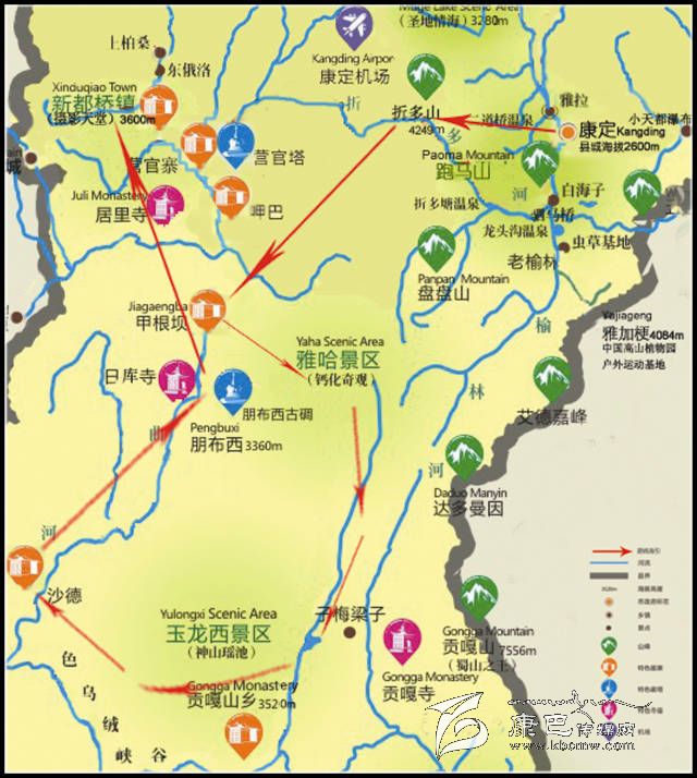 康定--折多山--甲根壩--雅哈埡口(海拔4200米)--泉華灘--子梅埡口(海拔4600米)--上木居--沙德--朋布西--新都橋